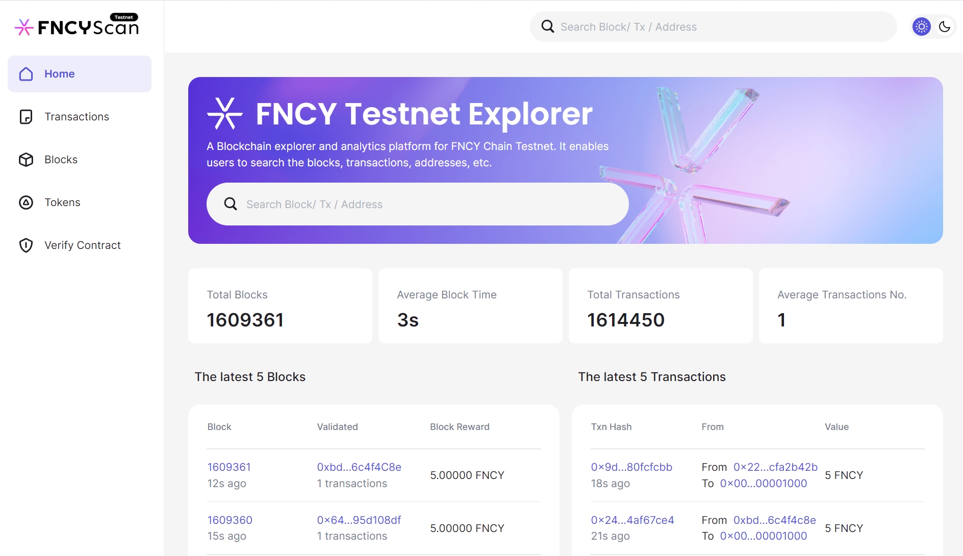 FNCYScan is a convenient and easy service to search information from FNCY blockchain. FNCYScan enables transparent transactions, blocks, wallet addresses, and other on-chain data from FNCY chain.