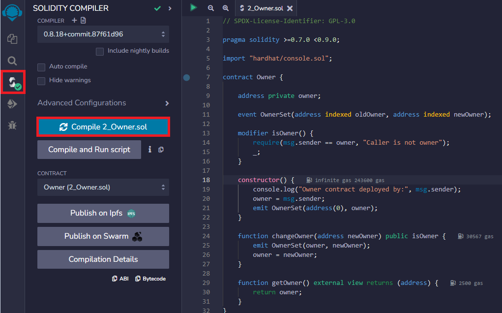 Press the Compile 2_Owner.sol button and it will compile automatically. If the compilation completes successfully, you will see a green mark.