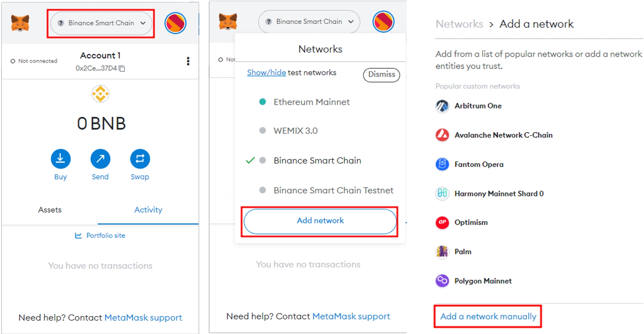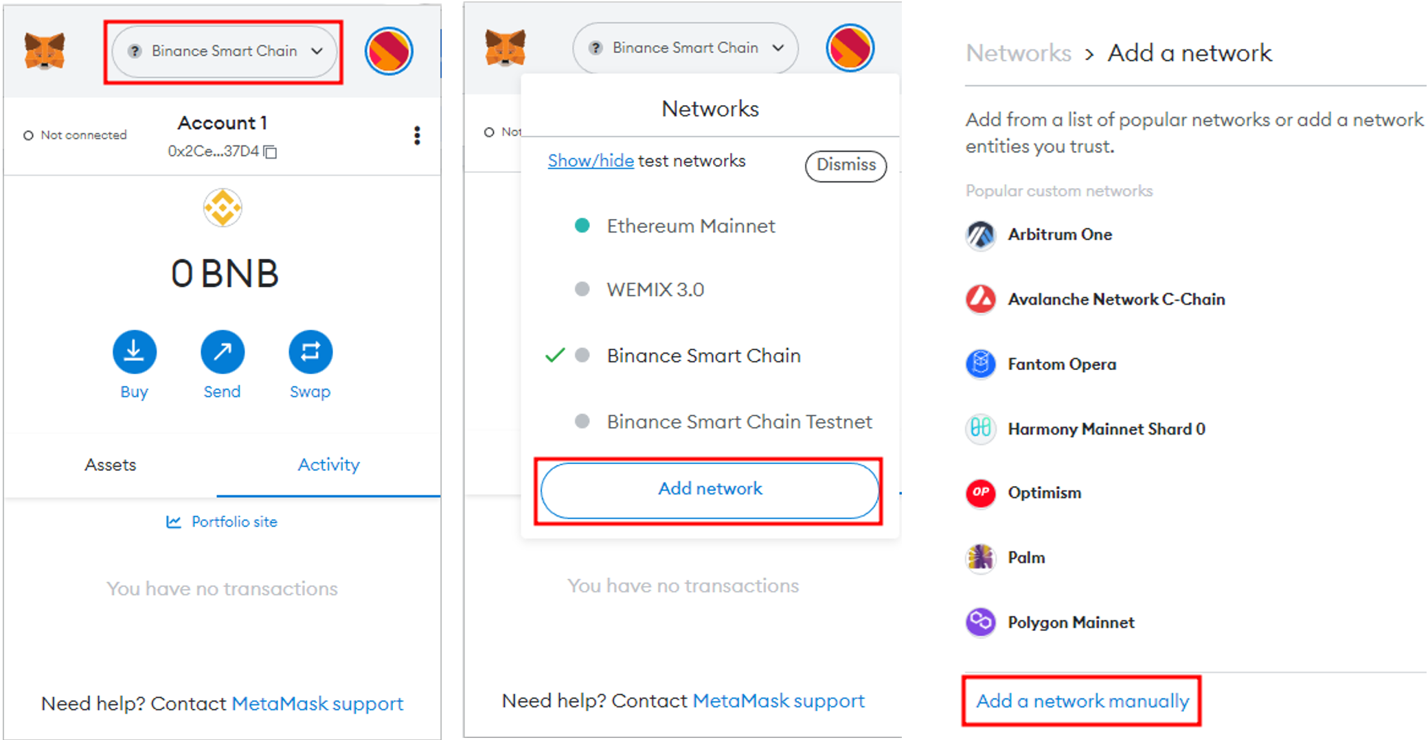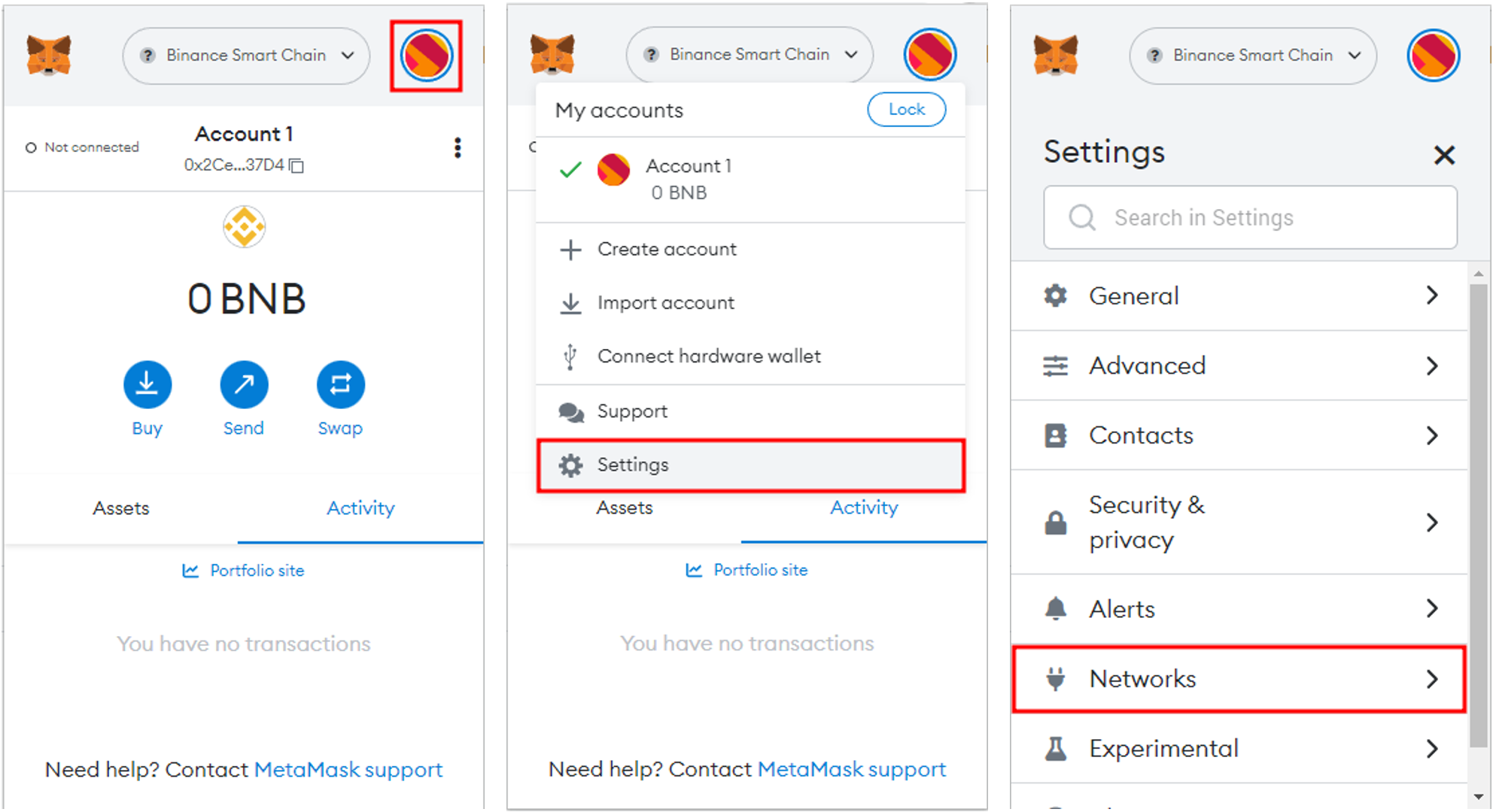 A. In your MetaMask wallet, go to the Settings menu or B. current network name will take you to the Add Network menu.