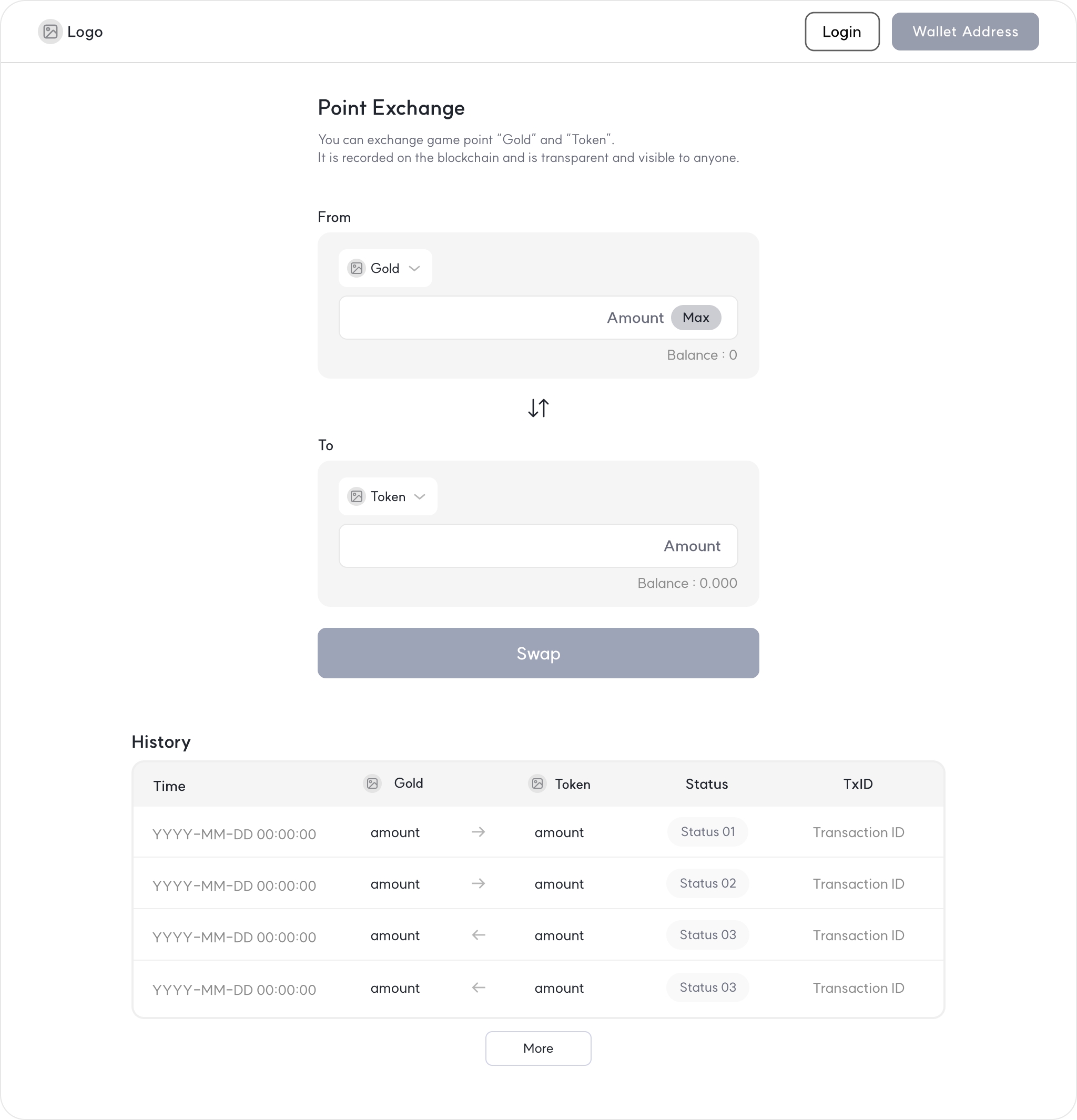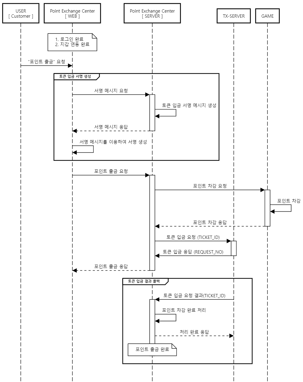 게임 서버에 포인트 차감 요청이 성공하면 TX-SERVER에 지정된 지갑주소로 토큰 입금 요청을 하며 결과는 추후 콜백의 요청 정보를 통해서 확인한다.