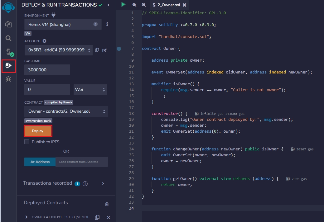 Remix IDE를 사용하여 스마트 컨트랙트를 성공적으로 배포했습니다. 이제 해당 주소를 사용하여 배포된 컨트랙트를 호출할 수 있습니다.