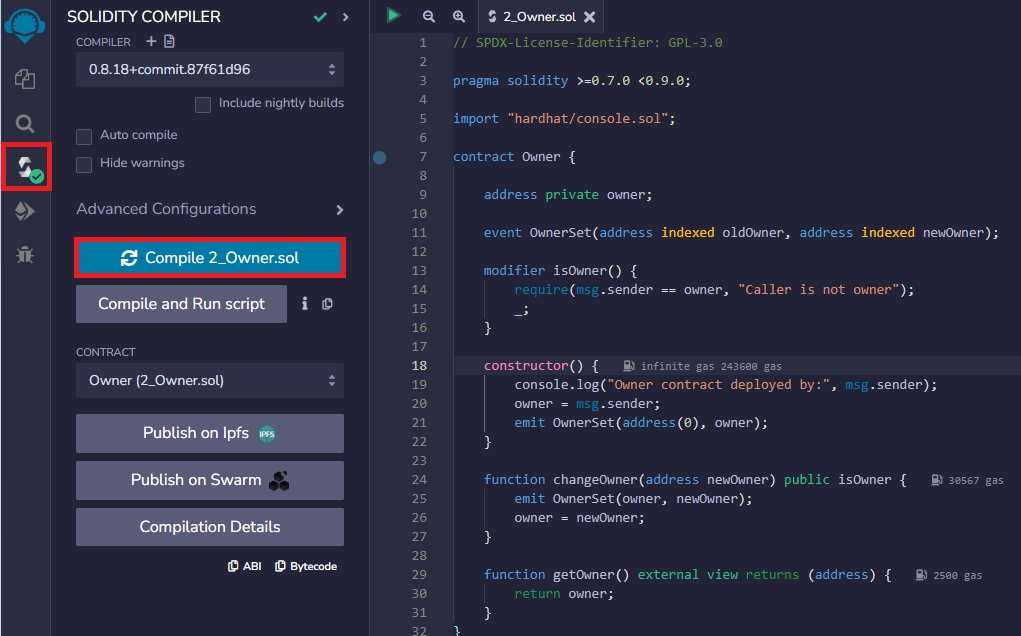 Compile 2_Owner.sol 버튼을 누르면 자동으로 컴파일 됩니다. 컴파일이 정상적으로 완료되면 초록색 마크를 확인하실 수 있습니다.