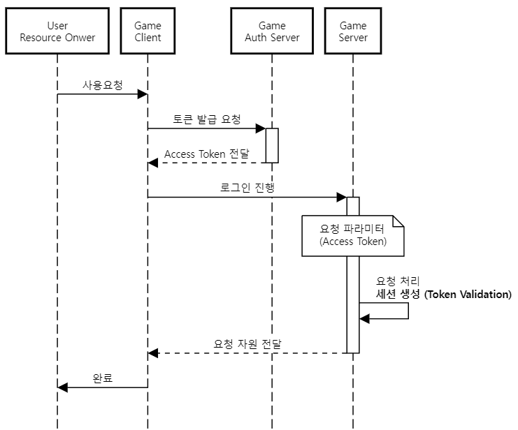 게임인증 서버에서 발급된 토큰을 이용하여 게임 서버에 전달하여 보호된 자원 요청에 사용합니다.